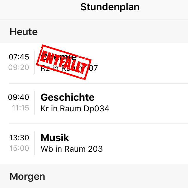Die App generiert dir täglich deinen Stundenplan, inklusive Vertretungsunterricht. Damit läufst du nie mehr in den falschen Raum, weil du die Änderungen auf dem Vertretungsplan verpasst hast.