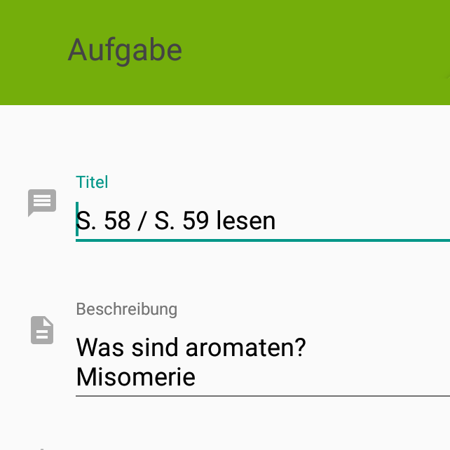 Deine Hausaufgaben trägst du am einfachsten direkt in der MDG App ein. Dadurch stellst du sicher, dass diese auf allen deinen Geräten synchron ist und du an das Erledigen erinnert wirst. Außerdem kannst du auf Aufgaben von Mitschülern zugreifen, die den selben Kurs belegen.